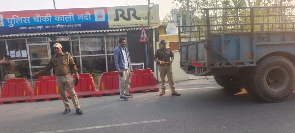 “हरिद्वार पुलिस द्वारा रात में ट्रैक्टर-ट्रॉली पर रिफ्लेक्टर टेप लगाते हुए अधिकारी”