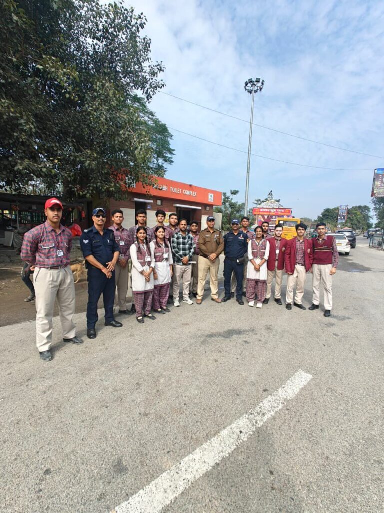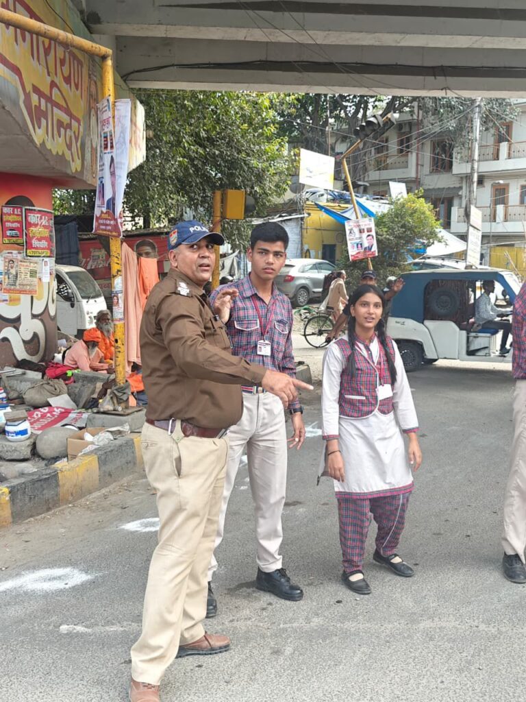 हरिद्वार में बीएमडीएवी स्कूल के छात्रों द्वारा यातायात संचालन का व्यावहारिक प्रदर्शन करते हुए दृश्य।